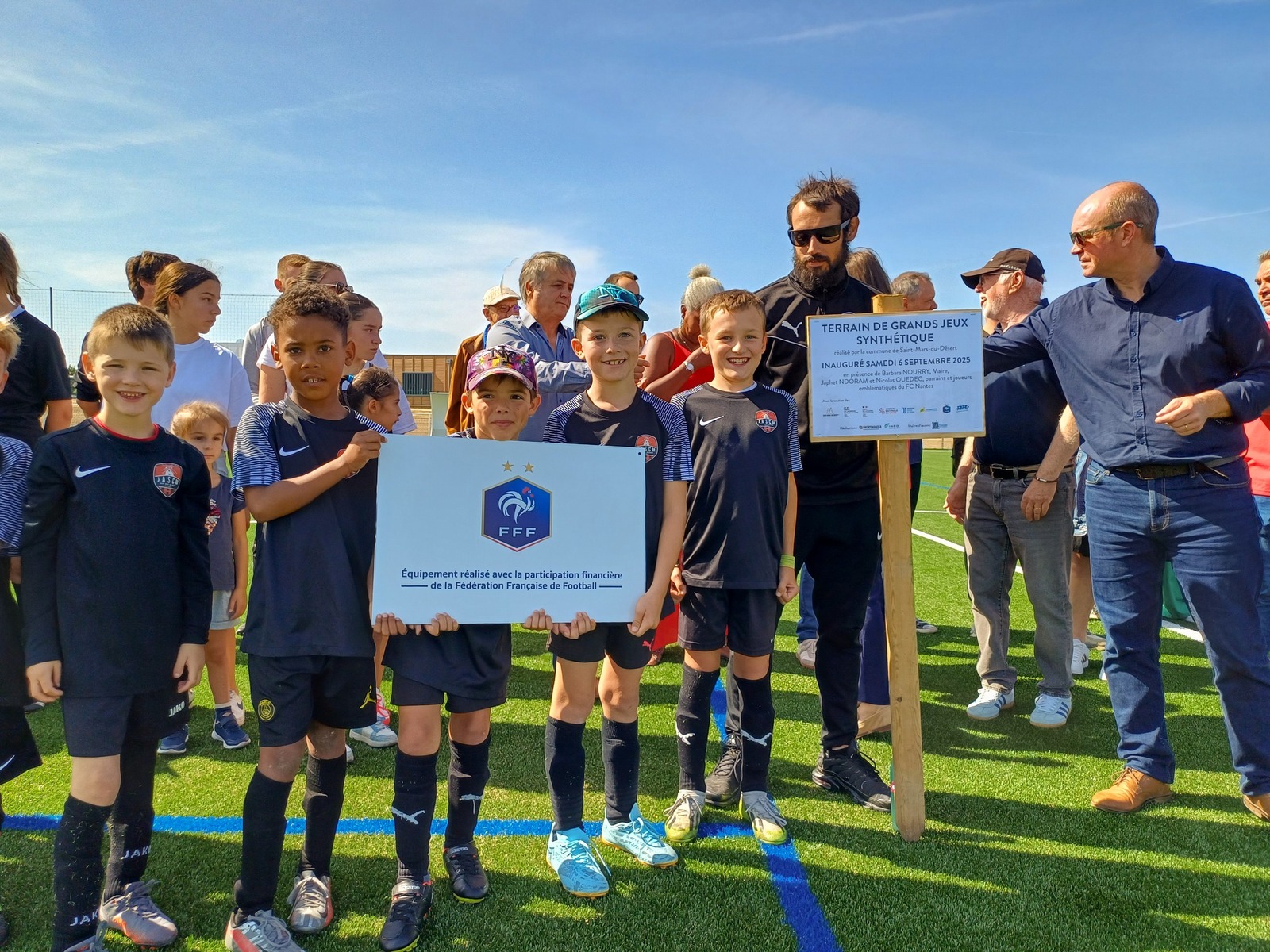 La municipalité de St Mars du Désert a inauguré le nouveau terrain de grands jeux synthétique avec deux parrains emblématiques : Japhet N'Doram et Nicolas Ouédec, anciens joueurs du FC Nantes.